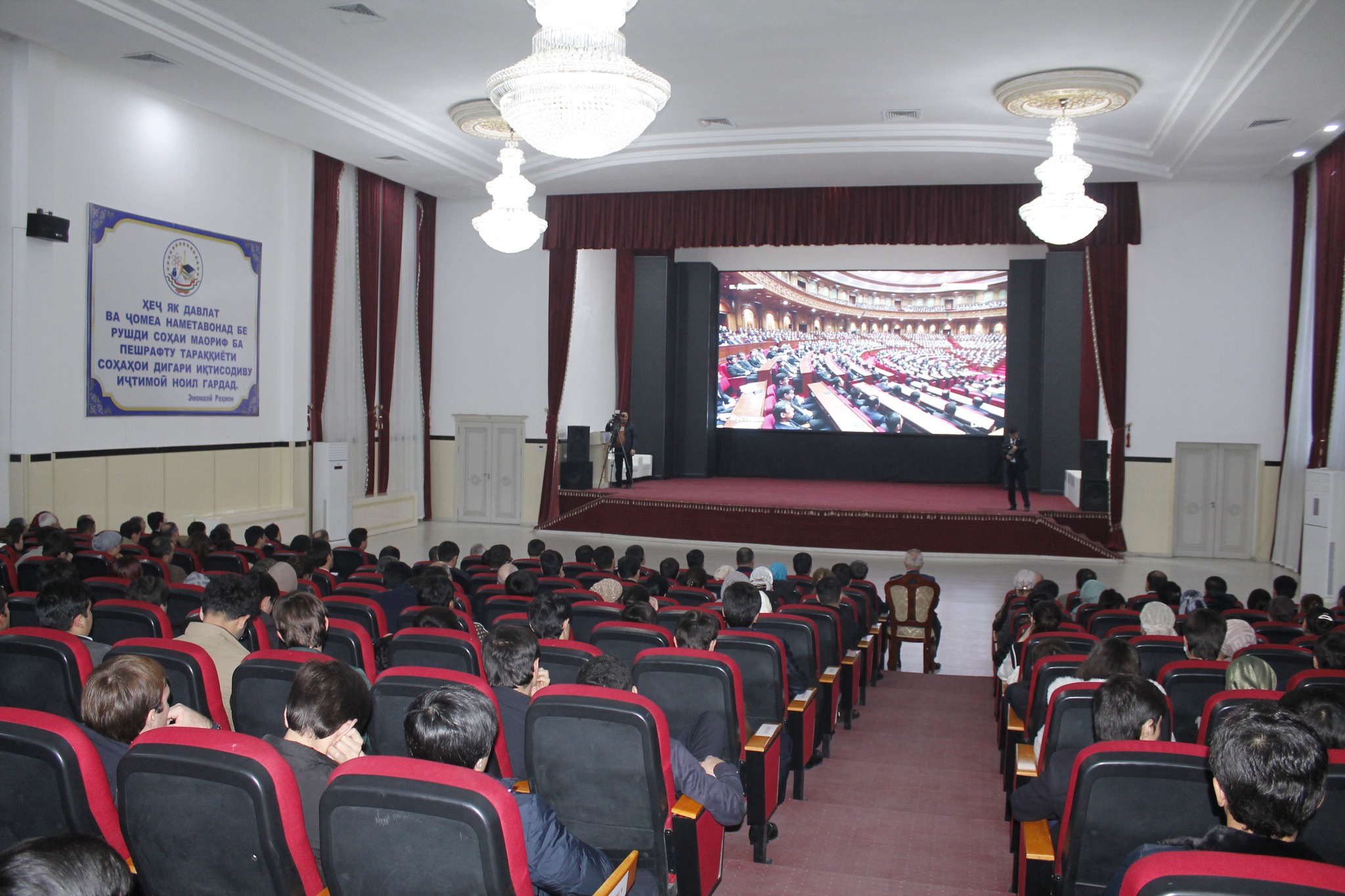Аҳли кормандони Институти илмию тадқиқотии рушди устувор ва иқтисоди сабзи Донишгоҳи байналмилалии сайёҳӣ ва соҳибкории Тоҷикистон дар якҷоягӣ бо кормандони дигар сохторҳои донишгоҳ бо як ҳисси ватандӯству худогоҳӣ баргузории Паёмро тариқи телевизион дар толори фарҳангии донишгоҳ тамошо намуданд.
